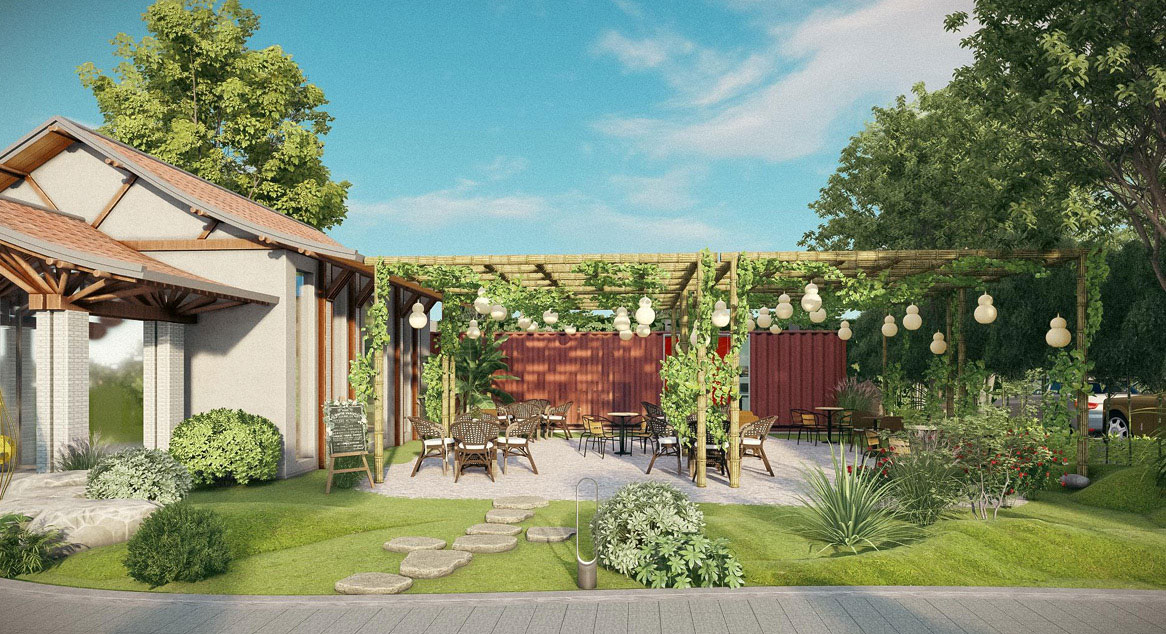 Nhà đón tiếp và sân cafe khách đợi